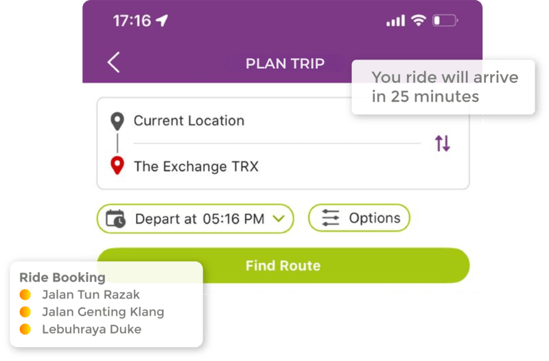 LUGO assists users by providing real-time information on nearby transportation options and suggests the best routes based on the transport’s availability and timing. This ensures efficient and convenient travel planning tailored to individual needs.